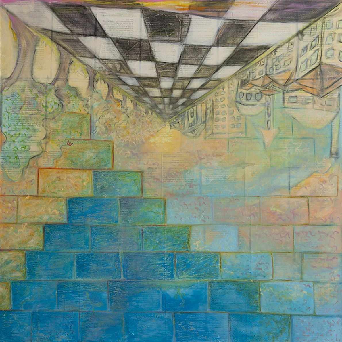 Technique: collage painting with acrylic colors, crayons, charcoal and varnish on canvas