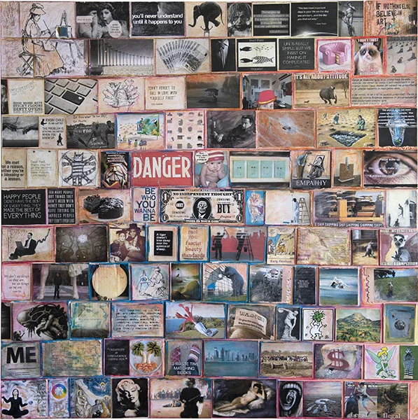 Material used: phrases and images from printed on photo paper, cardboard, glue, acrylic colors, crayons and varnish on canvas.
