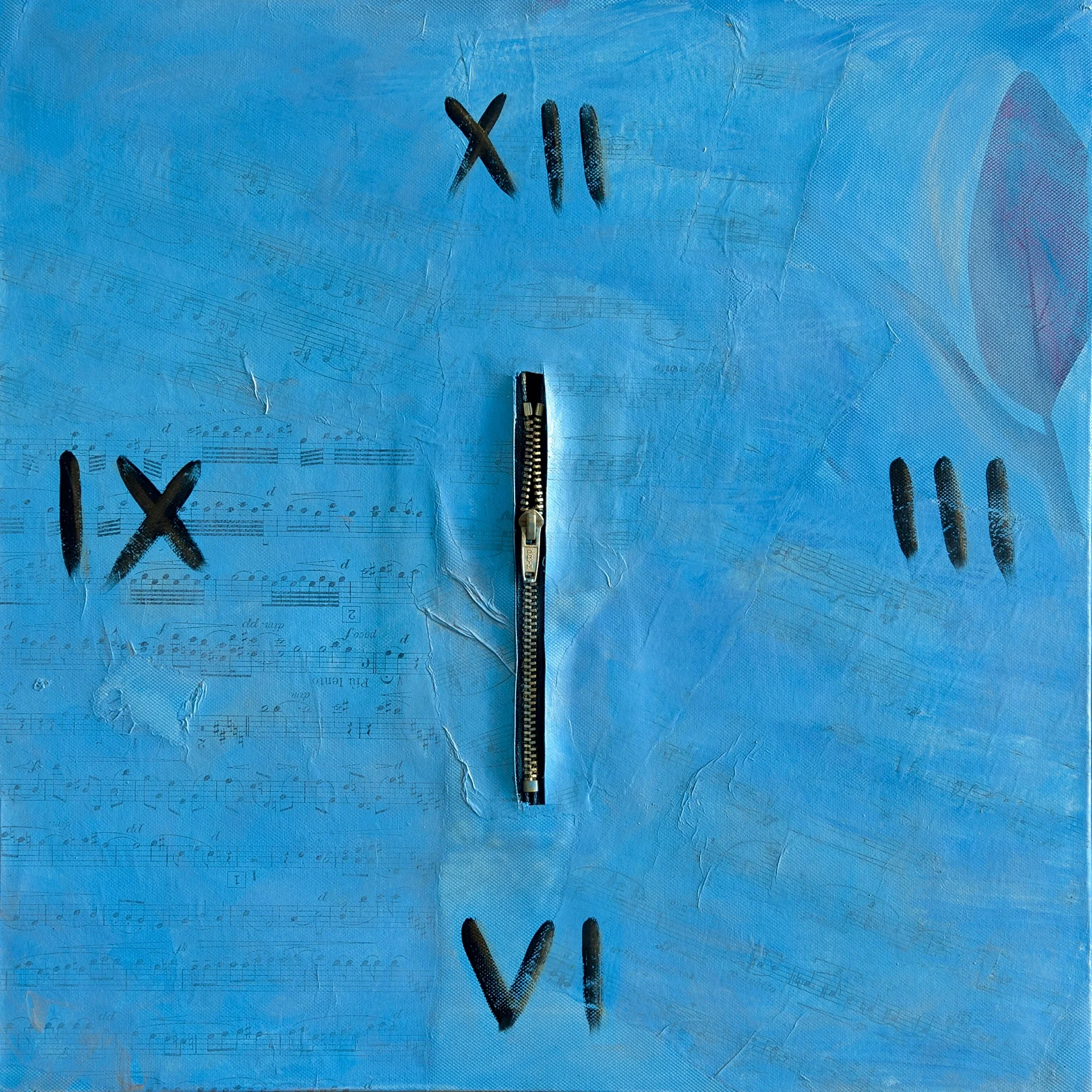 Materials used: musical notes on paper, glue, zip, acrylic colors and varnish on canvas with coloured wooden frame.