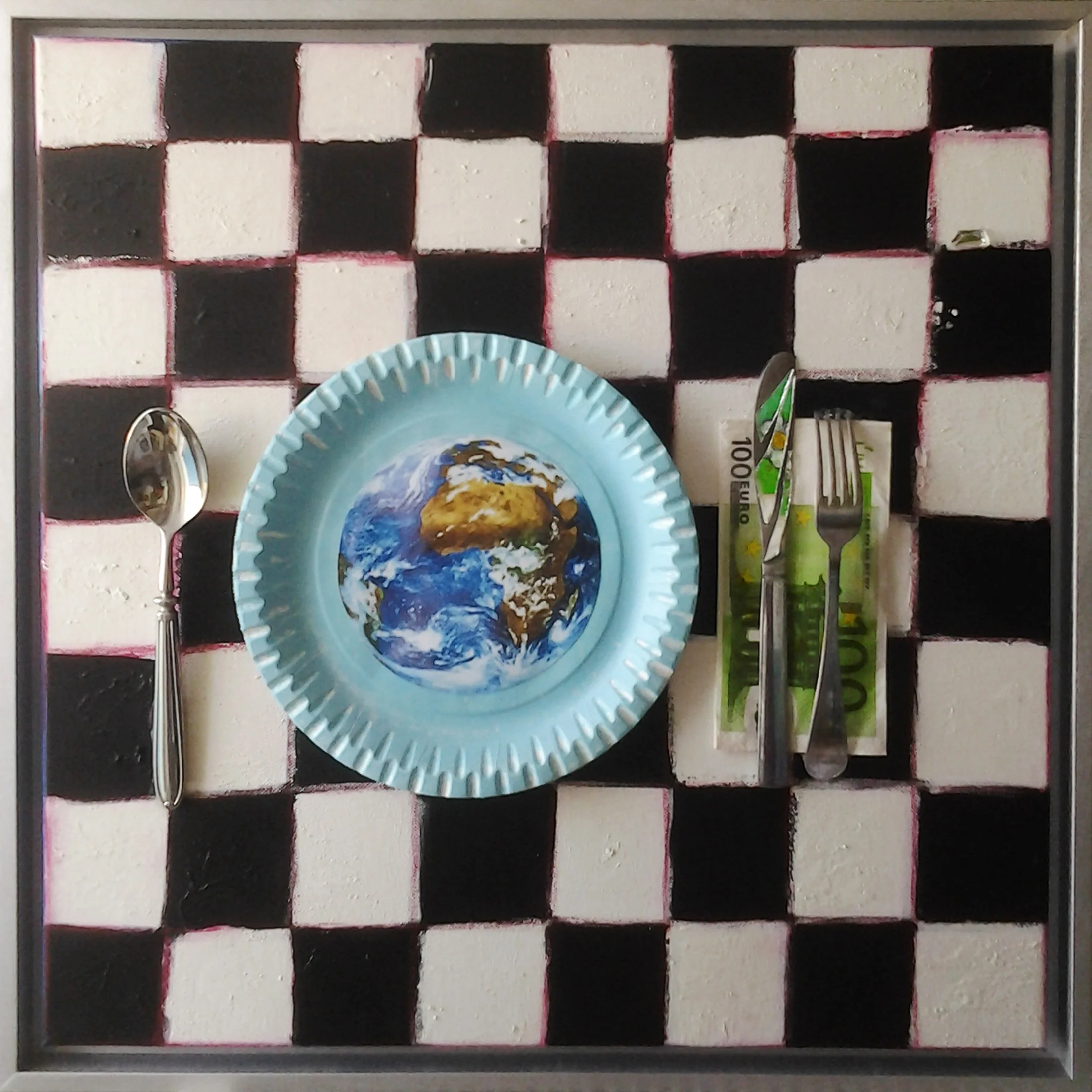 Material used: photo, pieces of mirror, cardboard plate, glue, napkins with printed 100€ on it, knife, spoon and fork, acrylics, crayons, charcoal, varnish and canvas. Canvas is framed with wooden colored frame.