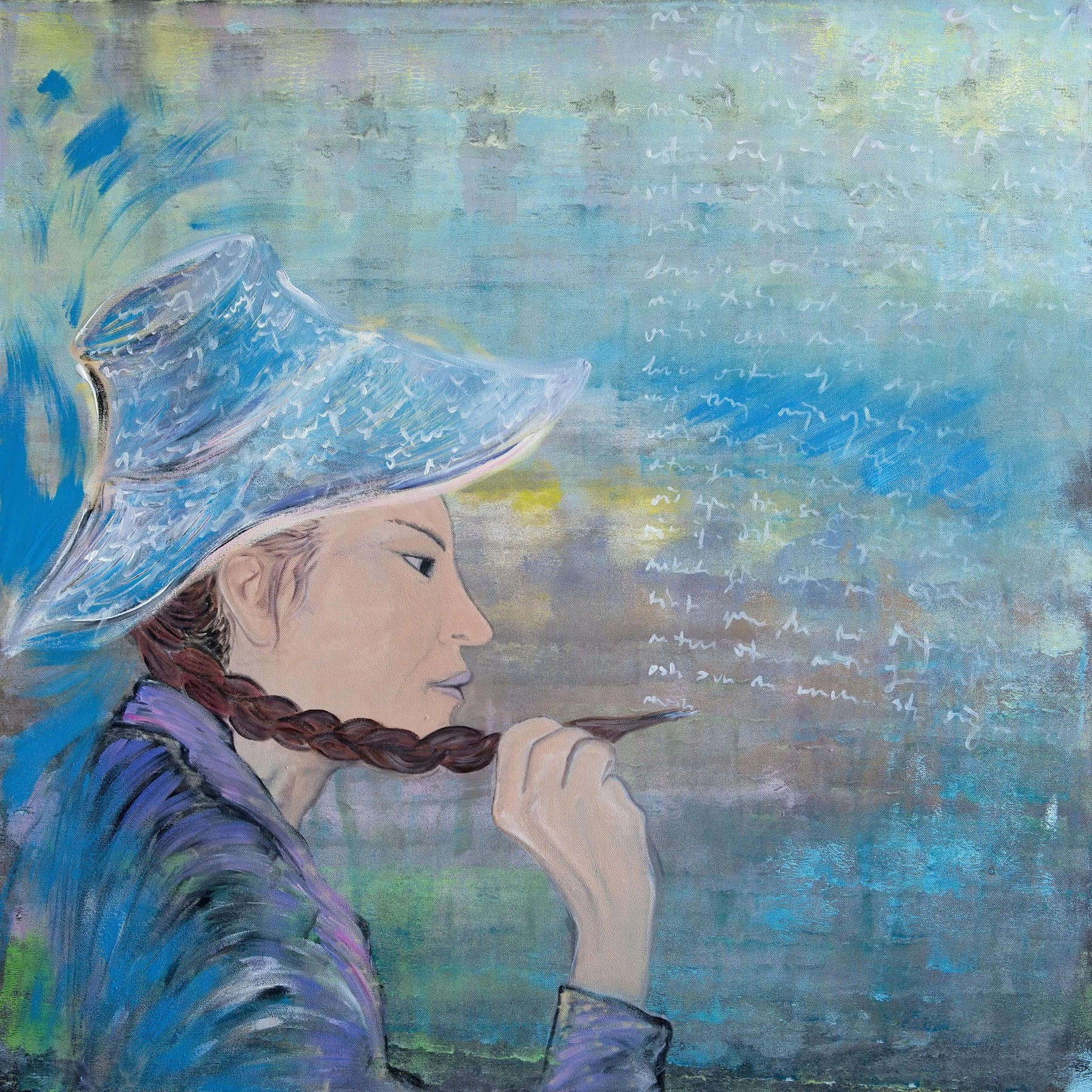 This particular painting is inspired by a photo that my daughter took of me, while I was painting with my hair. And this moment become like a symbol for me; because hair is a symbol of life and painting is a symbol of my work. So, this subject of painting with hair it could be a symbol of this symbiosis between my life and my work, which is actually Art. My art is my story, my poetry of life… and everybody can reflect in it. We all are human beings, searching for the truth and happiness in our lives.