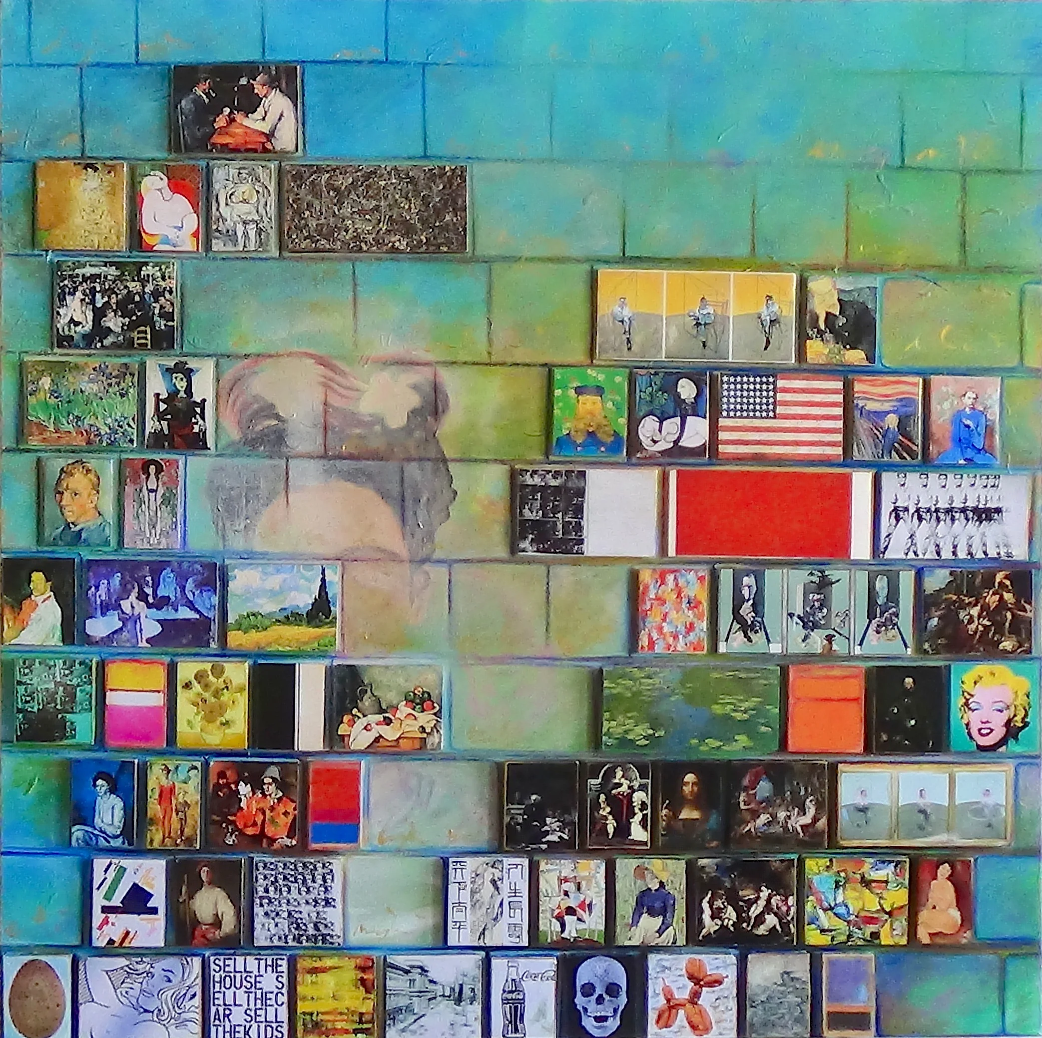 Material used: photos of most expensive artworks sold at auctions to date printed on photo paper, polystyrene board, glue, acrylic colors, crayons and varnish on canvas.