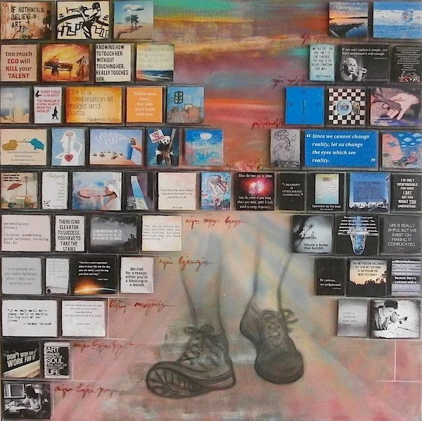 I began as a child with learning music, doing my personal diaries, writing poetry and short surrealistic stories. Then later playing also in Theater as an actress, but with time it was more and more apparent that my artistic vein was leading me towards visual arts, manifesting itself in painting, sculpture, artistic diaries, short films, installations, collages and murals.