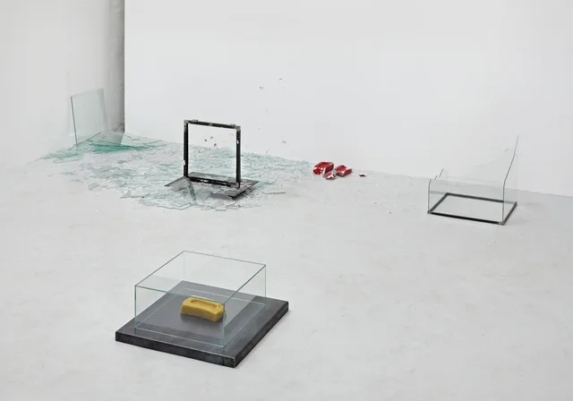nos encanta esta impactante obra de mirilia furman. a primera vista observamos tres espacios poco o nada revueltos en los que se muestra una caja de vidrio intacta con un objeto que aparenta ser una especie de jabón o cera. una caja similar, rota tan solo por una parte y una especie de vitrina destrozada con absolutamente todos los vidrios en el suelo, quebrada con lo que parece ser el mismo material del primer objeto. tres estancias distintas para este transparente material. realmente una innovadora manera de la artista de recordar la presencia y mostrar la ira ignorada del medio ambiente por medio de los civiles dentro de todo el activismo político que es constantemente ejecutado.